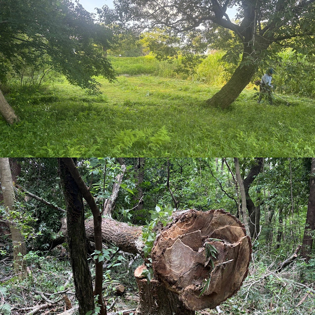 本日は予報でモーレツな暑さと言ってました。枯れ木の除去、通路の草刈り、竹切除などをしました。